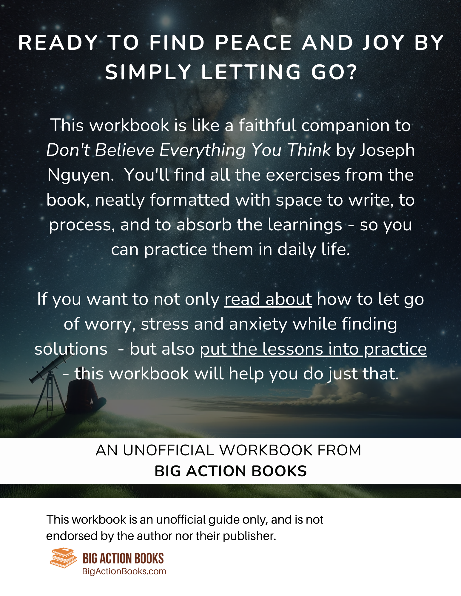 This workbook was created as a companion to Joseph Nguyen's "Don't Believe Everything You Think: Why Your Thinking Is The Beginning & End Of Suffering". While reading the book, we found ourselves wishing for a place where we could write, process and practice the book’s lessons in a constructive, concise way. There are so many valuable takeaways - but there isn't much space to actually write in the book itself.